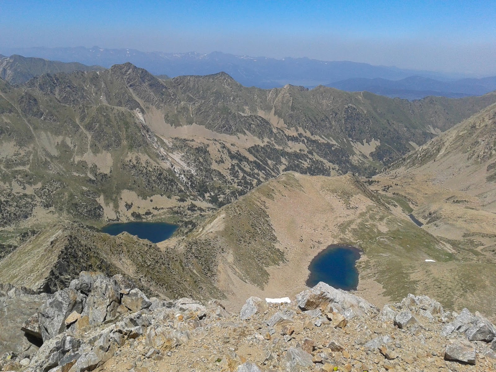 Todo el camino ha soplado viento, pero al llegar a la cresta, la agradable brisa se torna ventarrón. Hace sol (menos mal), pero las ráfagas dificultan la marcha, la hacen desagradable. Seguimos, enfundados en lo que cada un lleva en la mochila, ya por la línea de crestas. Pico Freser, Pic de l'Infern, Noucreus y de l'Eina.